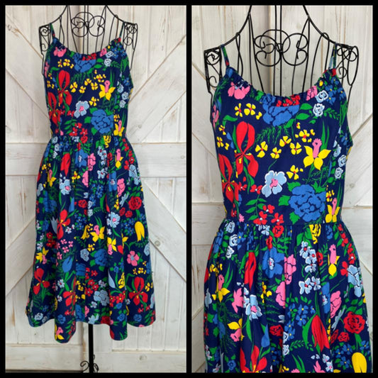 70's Vintage EJE Cotton Rainbow Blue Floral Hawaiian Sundress Day Midi Dress